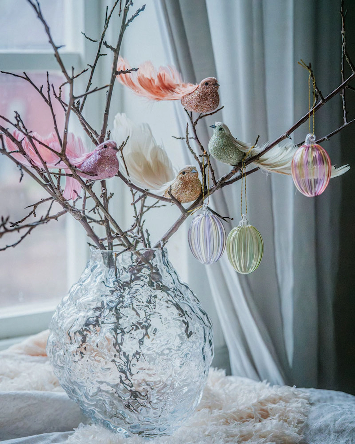 Glasägg rosa med subtila vertikala ränder och guldfärgat snöre ger en lätt och lekfull känsla till din inredning. Det här dekorativa ägget i glas fungerar lika bra som påskpynt som en året‑runt detalj i fönster eller i en grenkrona.