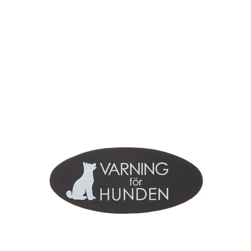 Varning för hunden skylt är en stilren dörrskylt i plåt som informerar besökare tydligt utan att dominera entrén. Oval form, svart bakgrund och vit text med hundsilhuett gör budskapet lättläst.