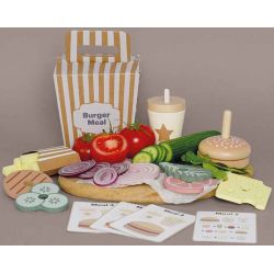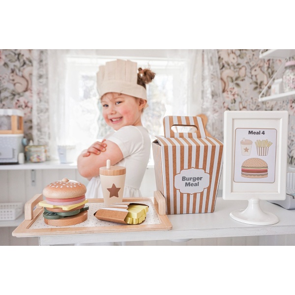 De fyra menykorten ger förslag på olika blandningar av hamburgare, pommes frites och den inkluderade drycken. Gränserna är omätbara då endast fantasin bestämmer. Detta hamburgarepaket uppmuntrar till en fantasifull och kreativ lekstund.