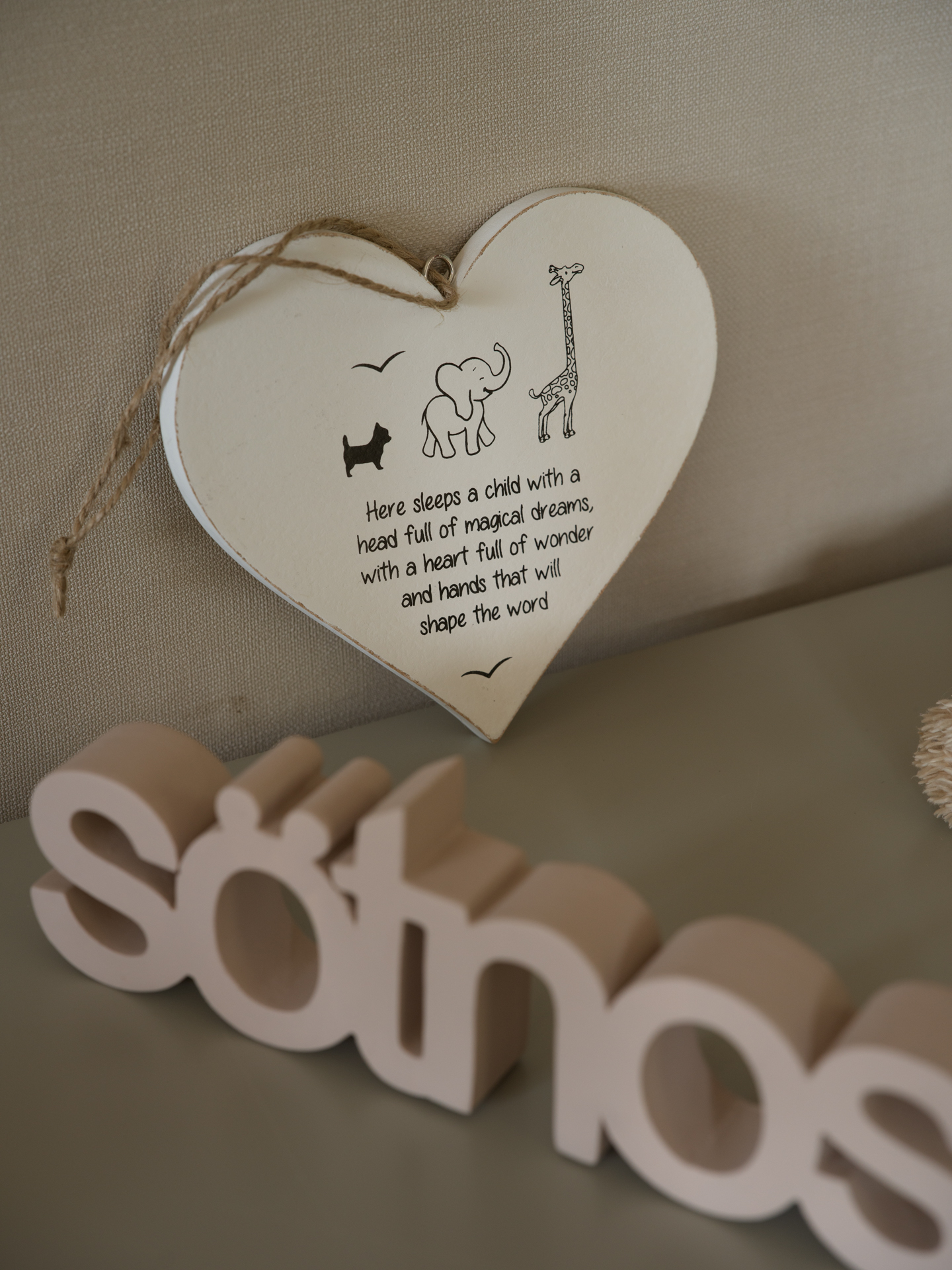 Hjärta Hängande i Trä ”Here sleeps a child…” 15 cm – En söt detalj till barnrummet