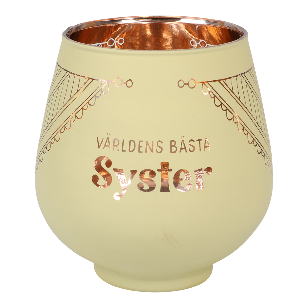 Charmig ljuslykta med texten ”Världens bästa Syster” och varm metallic-insida. Denna ljuslykta syster är en personlig och stilren present till någon du håller av.