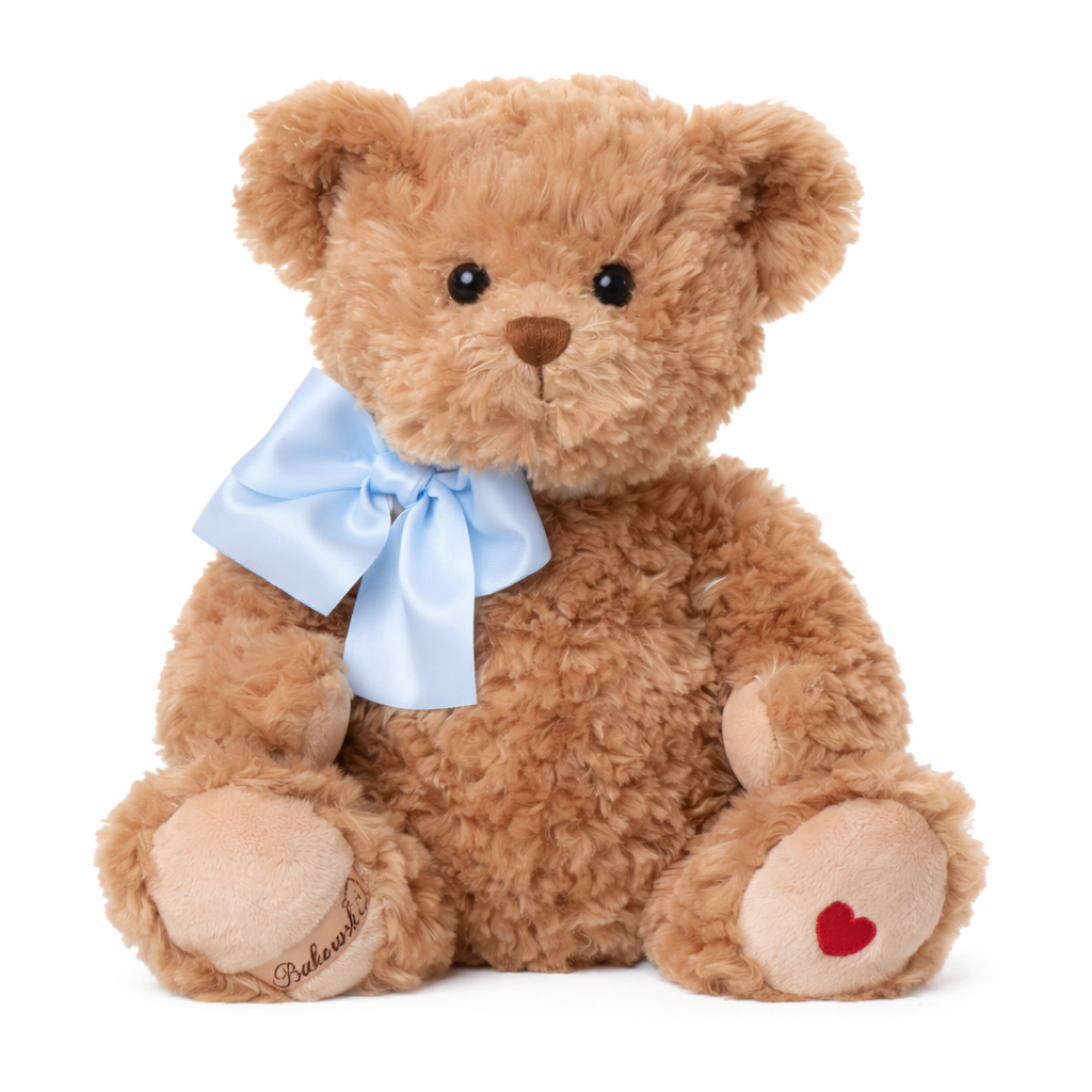 Ludwig Blå Rosett – en charmig nallebjörn från Bukowski Design i mjuk plysch. 35 cm stor med handbroderier och vacker blå rosett. Perfekt present till nyfödd eller som julklapp.