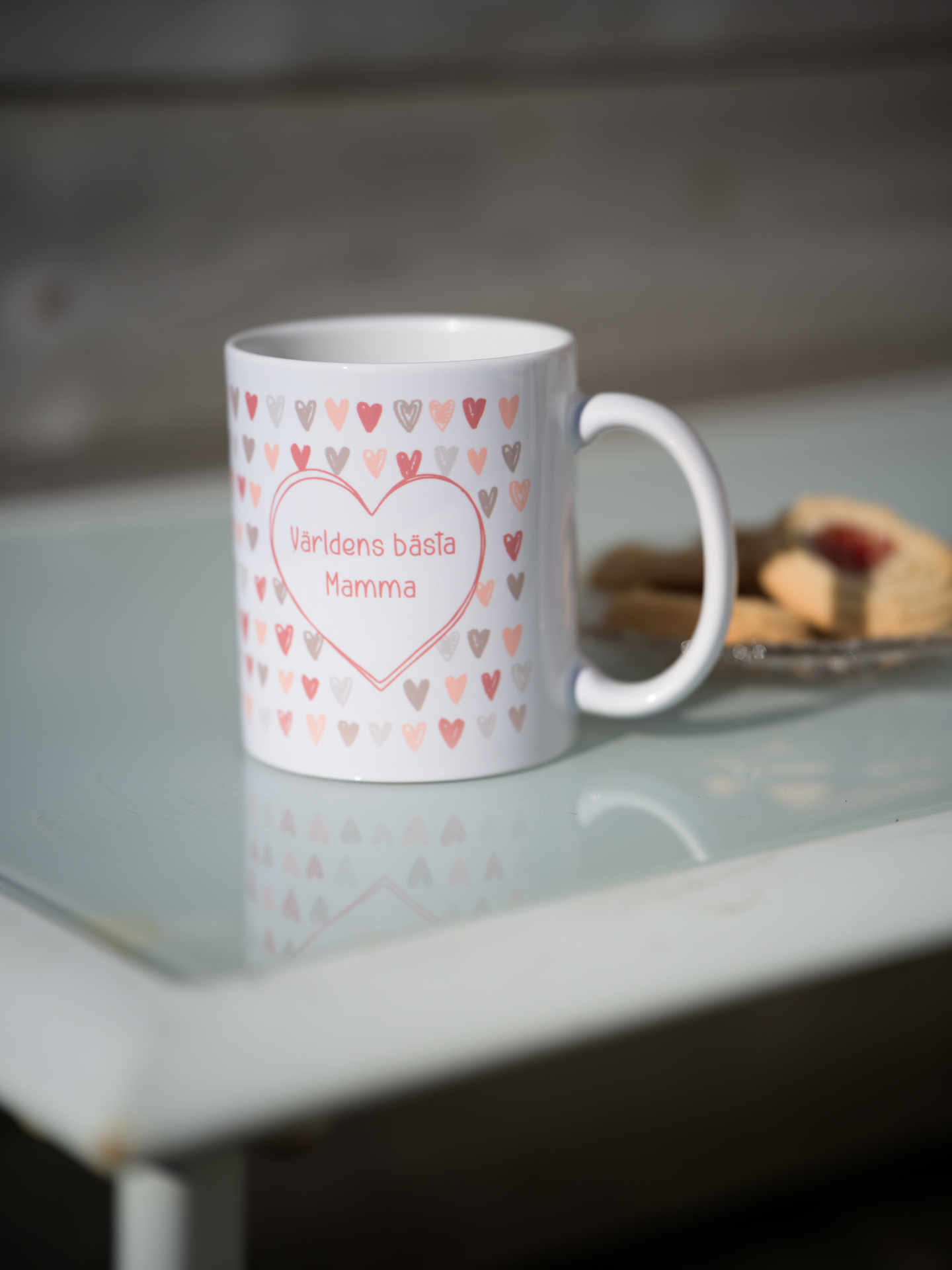 Vit mugg med mönster av små hjärtan och texten ”Världens bästa Mamma”. En omtänksam och enkel present – perfekt som mugg till mamma.