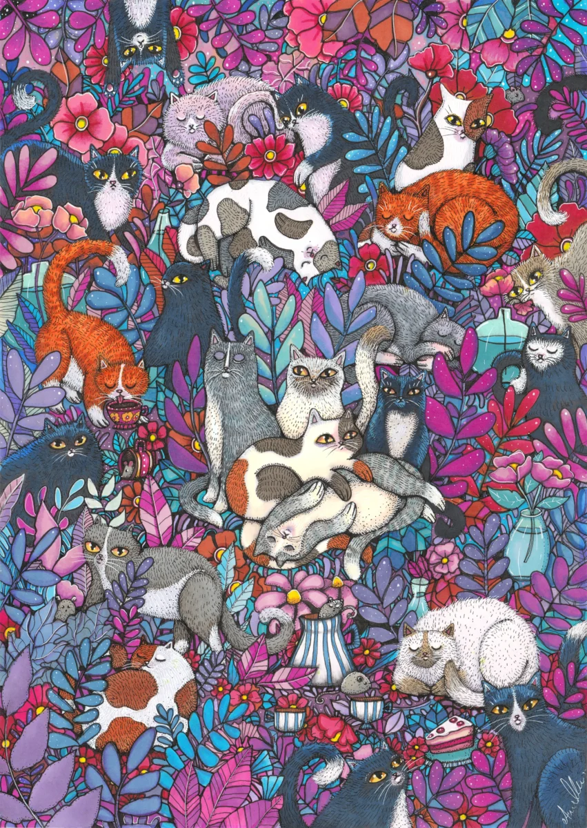 Postern är en hyllning till djurens värld med illustrationer som sprakar av liv och glädje. Med detaljerade teckningar, skapade med tusch och poscapennor, fångar Anna den oskyldighet och charm som bara en katt kan utstråla. Varje figur på postern har sitt eget lilla äventyr, vilket ger den en narrativ kvalitet som gör att betraktaren inte bara ser, utan också upplever. Det är konstverk som talar till vårt inre barn och väcker känslor av glädje och nostalgi.