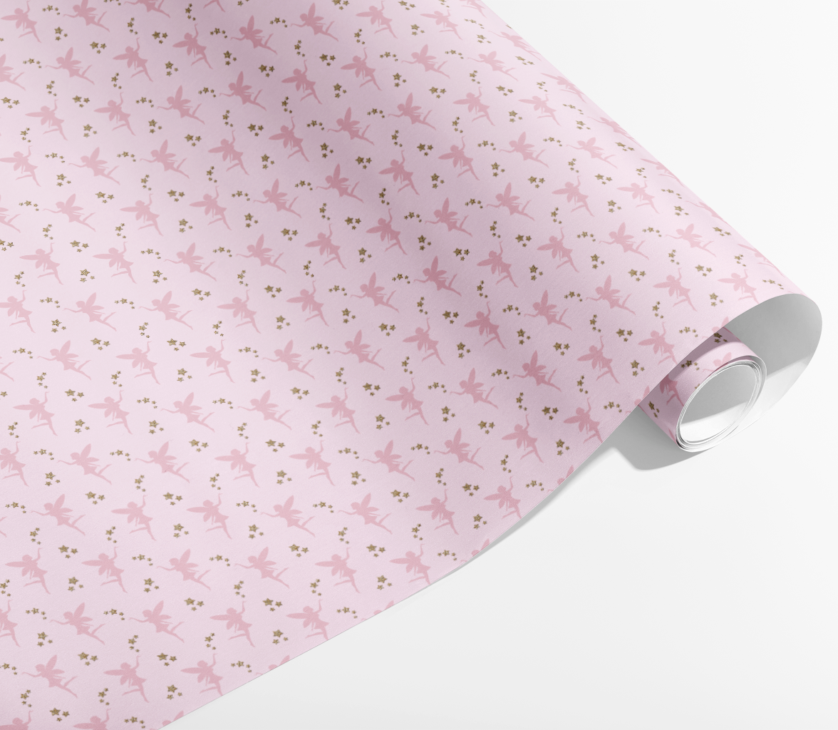 Presentpapper med älvor och guldstjärnor – rosa kraftpapper 70×200 cm