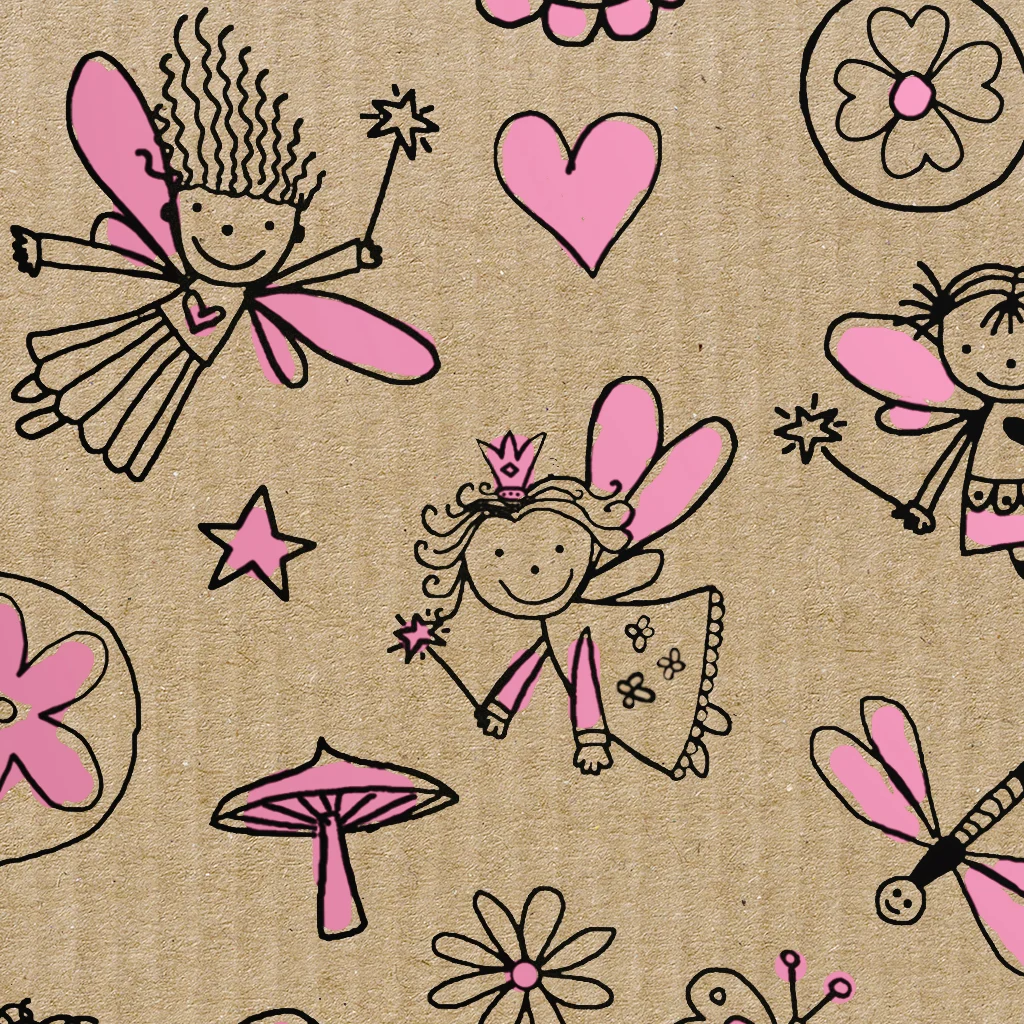 Detta presentpapper eco friendly i tåligt kraftpapper kombinerar ett lekfullt motiv med praktisk kvalitet. De rosa älvorna och sländorna ger en mjuk, sagolik känsla som passar utmärkt till barnkalas, dop, babyshower och alla tillfällen där du vill skapa ett extra omtyckt paket. Från The Unique Paper Company.