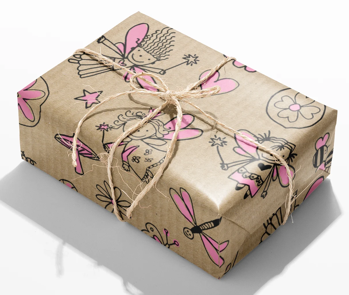 Presentpapper eco friendly i kraft med rosa älvor och sländor. 70×200 cm – ett hållbart och lekfullt val för paket som ska sticka ut.