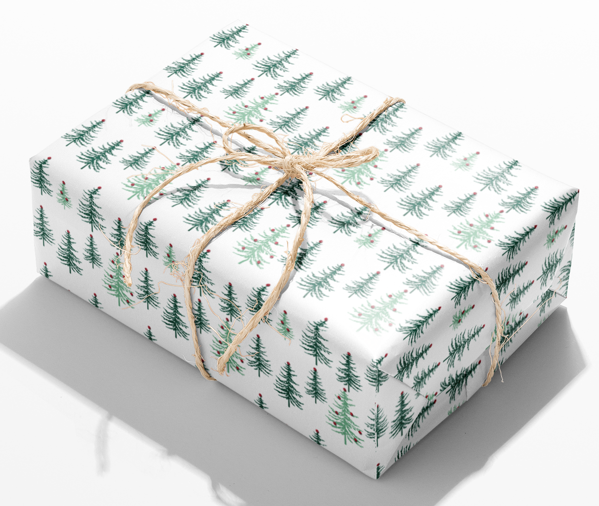 Presentpapper med gröna granar – vit kraftpapper 70×200 cm