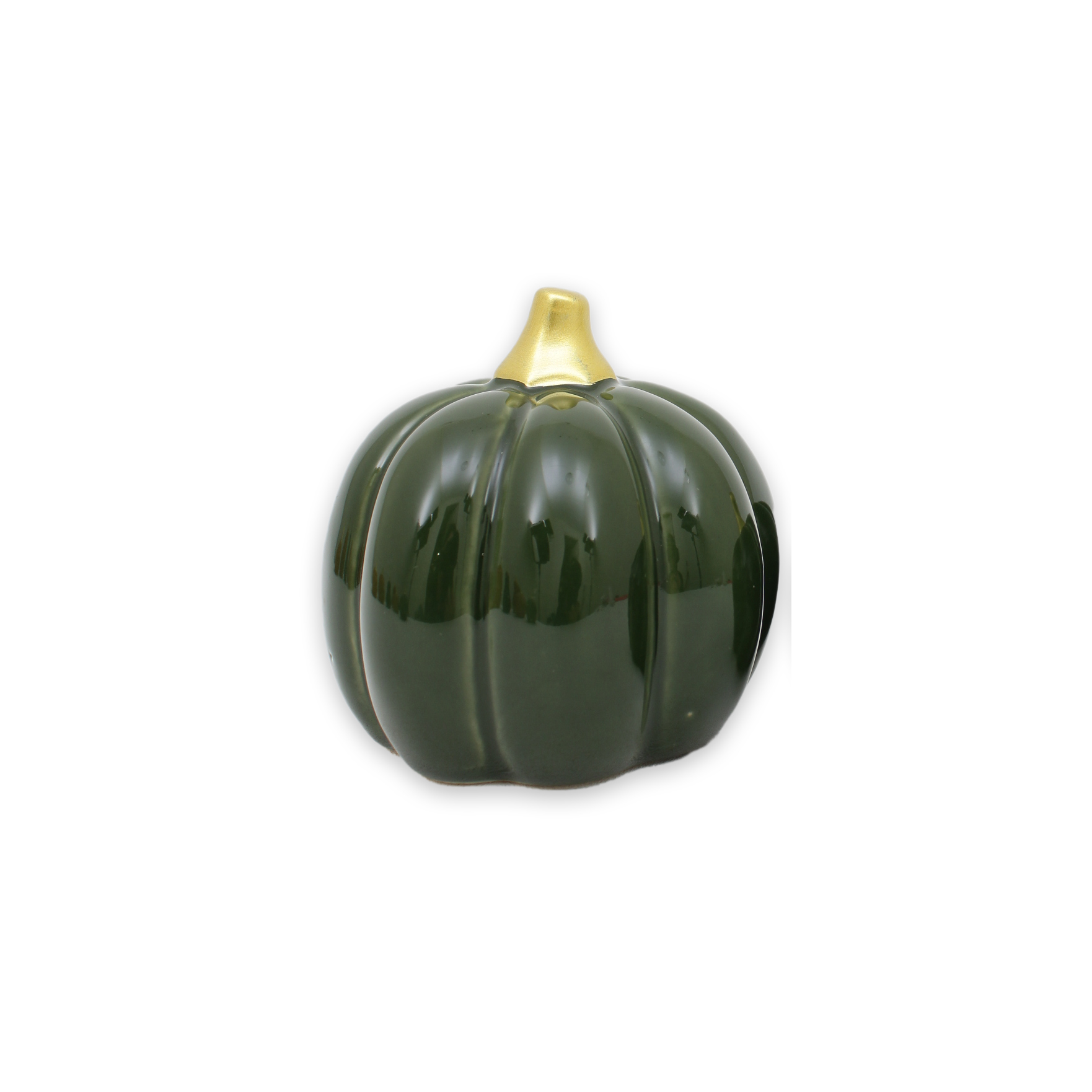 Den djupa gröna färgen ger en känsla av lugn och harmoni, medan den glänsande ytan reflekterar ljus på ett vackert sätt. Den gyllene stjälken ger en fin kontrast och lyfter hela designen. Oavsett om du placerar den ensam eller i en grupp med andra dekorationer, kommer denna pumpa att dra blickarna till sig och skapa en inbjudande atmosfär.