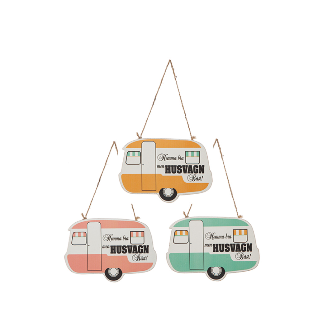 Den charmiga träskylt husvagn är en dekorativ träskylt i karavanform (15×10 cm) med texten ”Hemma bra, men HUSVAGN bäst!”. Den här skylten ger en varm och lekfull detalj i husvagnen, på campingplatsen eller i hemmets inredning.