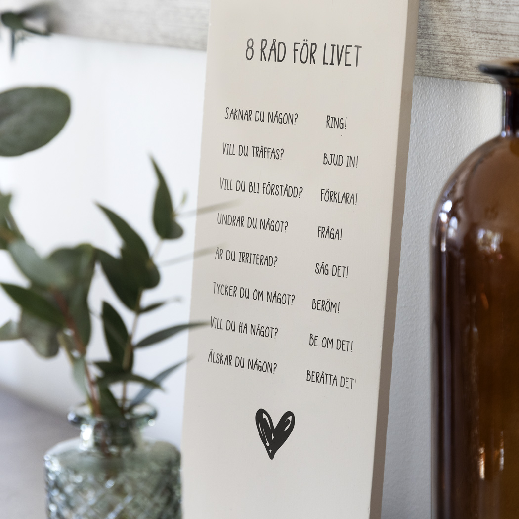 Trätavla 8 råd – dekorativ och lättplacerad i beige. En kort och varm påminnelse för vardagsrummet, hallen eller som gåva. Beställ idag.